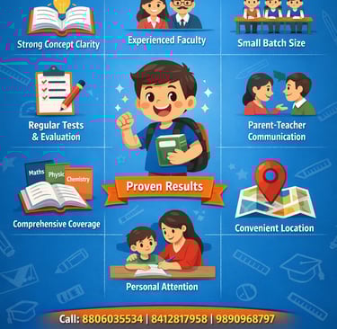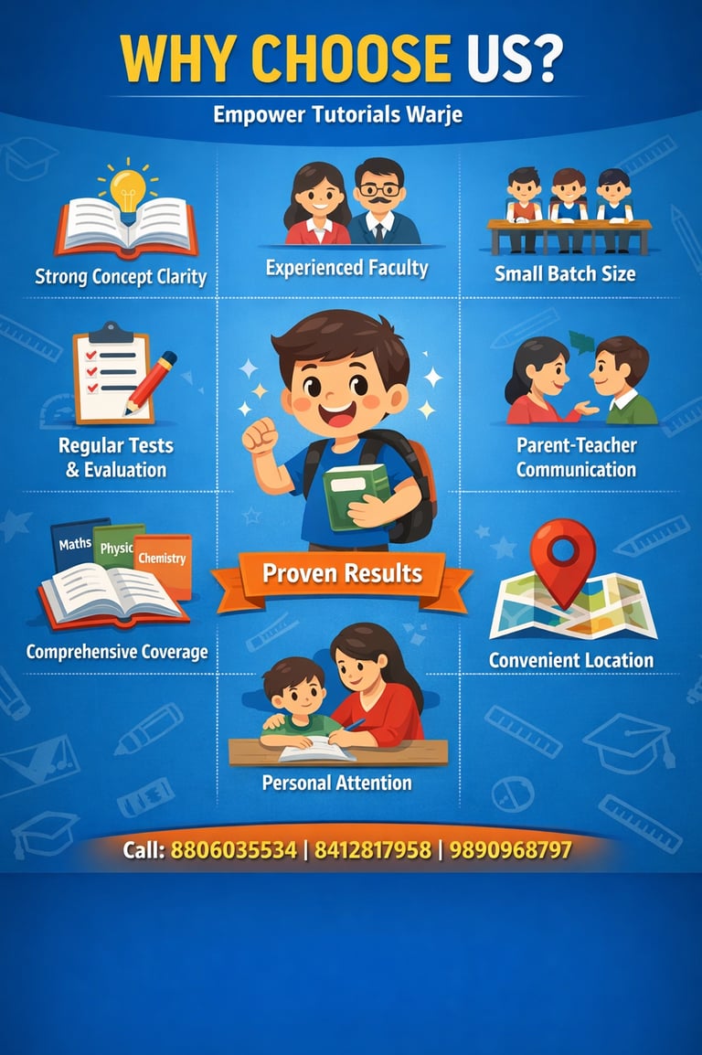 Choosing the right coaching institute is one of the most important decisions for your childβs academic success. At Empower Tutorials Warje, we are committed to delivering quality education, personal attention, and consistent results for students from 8th to 10th (SSC, CBSE, ICSE).